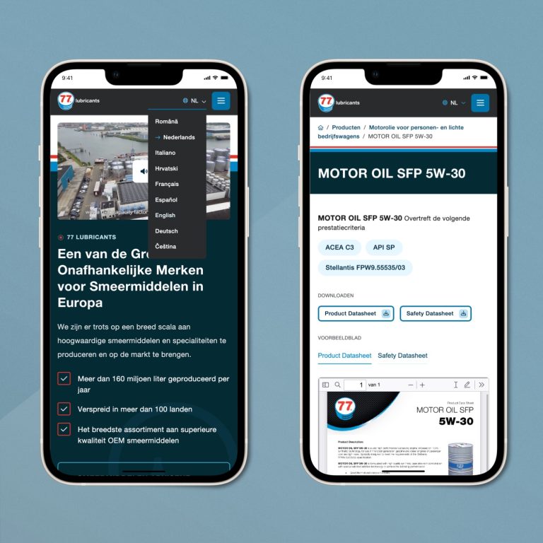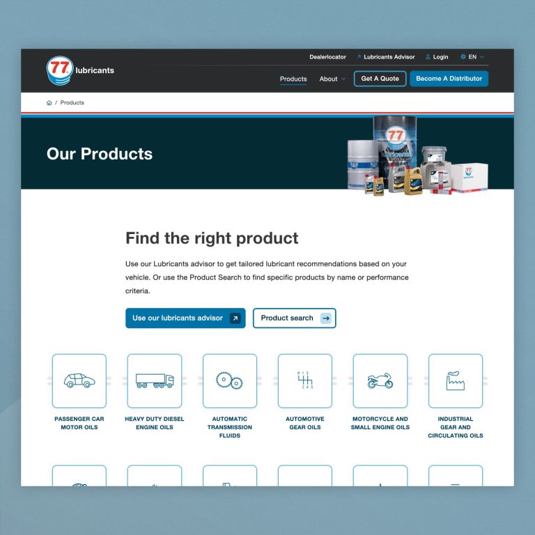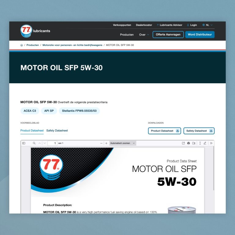 77 Lubricants is een wereldwijd opererend merk in hoogwaardige smeermiddelen. Het merk produceert in Nederland, en dat straalt vertrouwen uit richting internationale klanten. Die herkomst komt dan ook duidelijk terug in het ontwerp van de site. Voor deze internationale speler ontwikkelden we de officiële merkwebsite: een krachtige, meertalige site die fungeert als informatietool, dealerplatform én acquisitiemiddel voor nieuwe distributeurs.