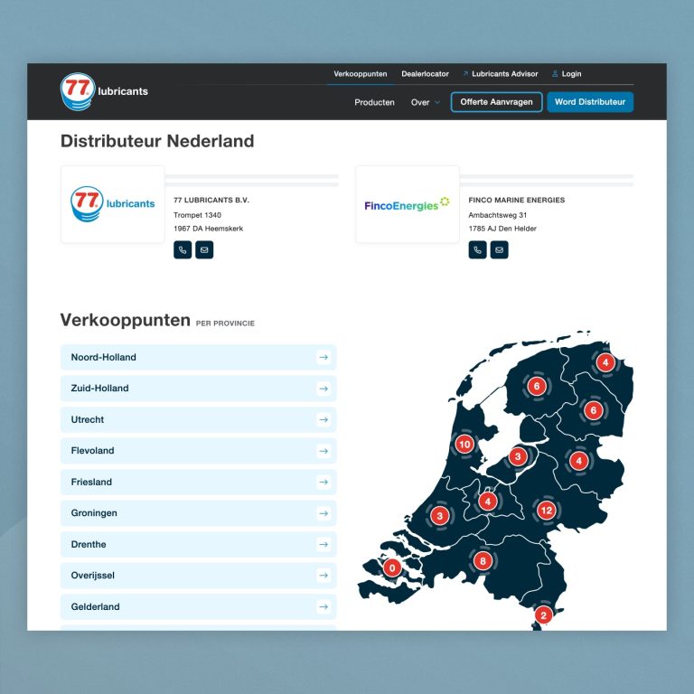 Het internationale karakter van 77 Lubricants vroeg om een website die wereldwijd inzetbaar is. Daarom is de site beschikbaar in maar liefst 9 talen. Per taal kan bovendien specifieke inhoud worden getoond. Zo hebben we voor de Nederlandse versie een extra overzicht toegevoegd met verkooppunten per provincie. Elke bezoeker, waar ook ter wereld, krijgt zo toegang tot relevante informatie in de eigen taal en in veel gevallen ook volledig afgestemd op de lokale markt.