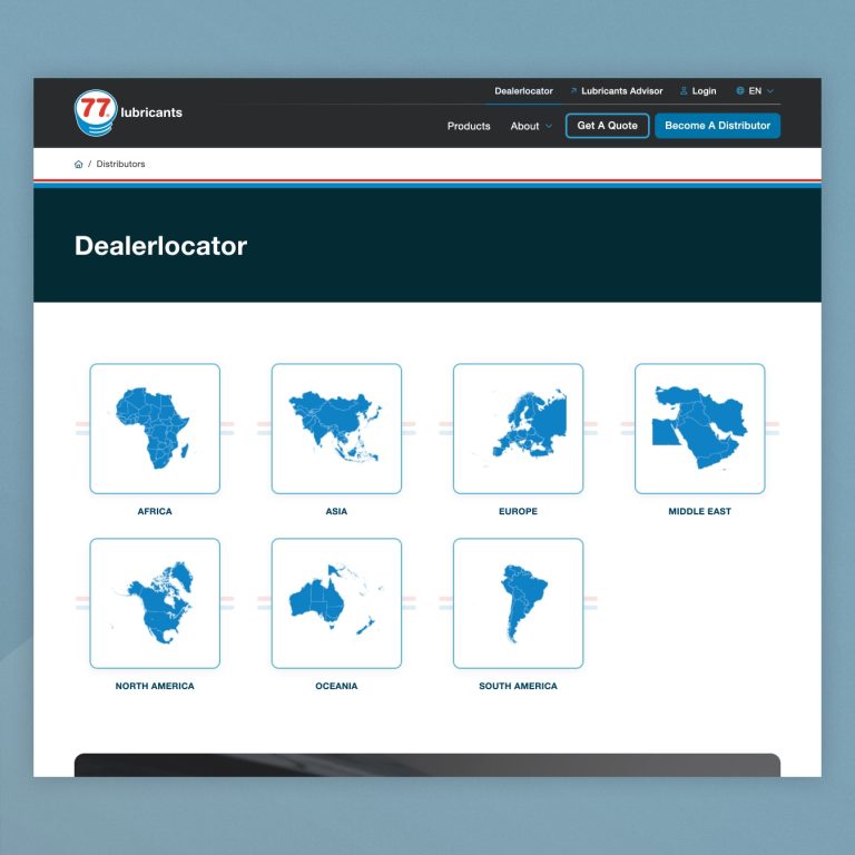 Een van de kernfuncties van de site is de dealer locator: een overzichtelijke indeling per continent en per land. Klanten en distributeurs kunnen zo eenvoudig zoeken naar een lokale vertegenwoordiger in hun regio. Met dealers in meer dan 100 landen is 77 Lubricants wereldwijd bereikbaar en via de website altijd snel te vinden.