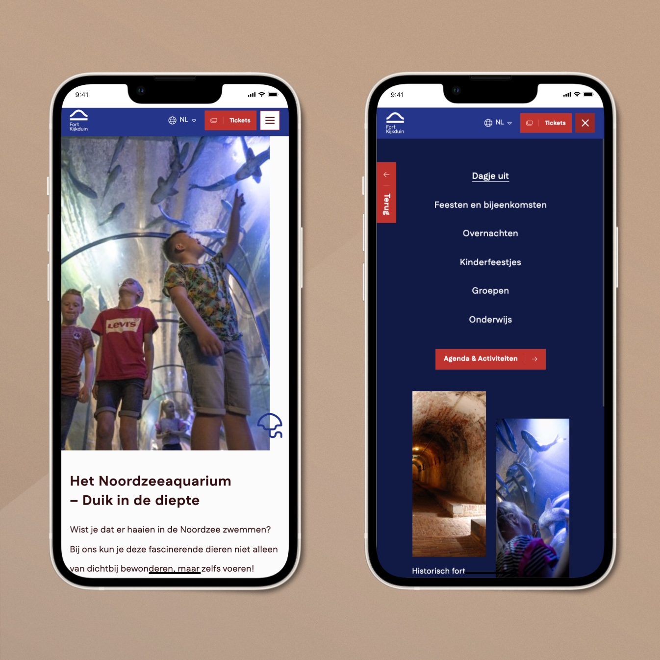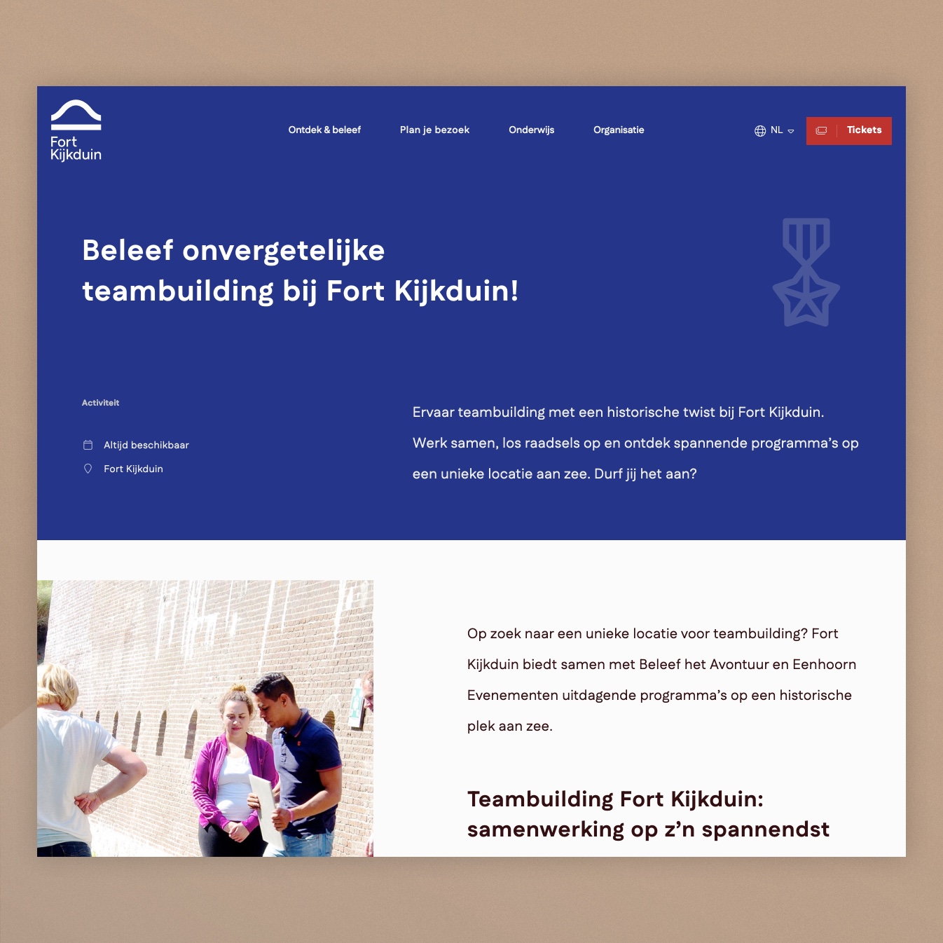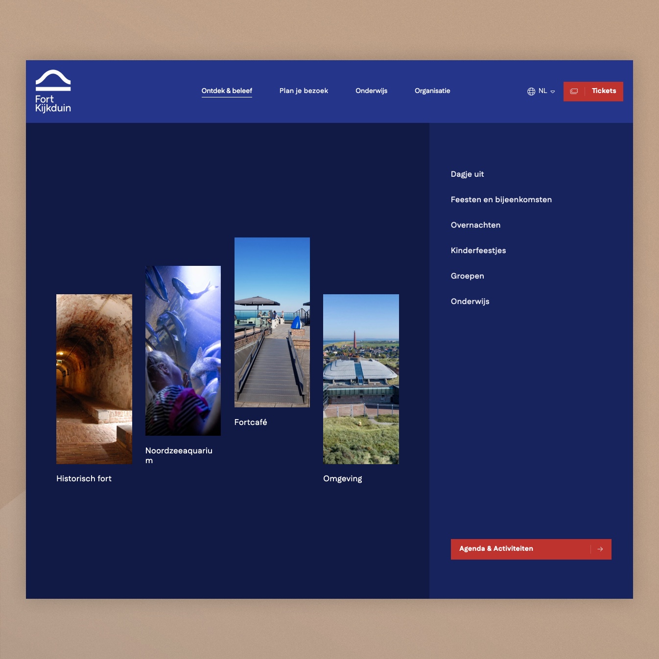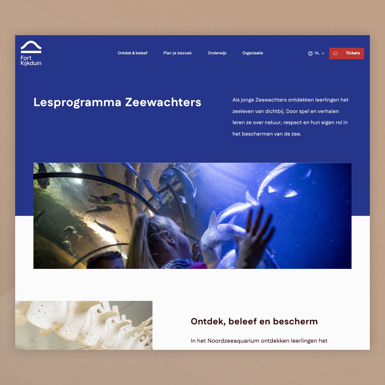 Fort Kijkduin is een museum en zeeaquarium in Den Helder waar bezoekers door het fort lopen, vissen bekijken en de kustgeschiedenis van dichtbij zien. Wij ontwikkelden een nieuwe website op basis van de nieuwe visuele identiteit, met duidelijke bezoekersinformatie, logische navigatie en een Ontdek & beleef-gedeelte waarin ook de omgeving een vaste plek heeft. Een ontwerp dat voelt als het fort We kregen deze nieuwe identiteit aangeleverd in een helder brandbook. Aan ons de taak om dit te verwerken in een website-ontwerp dat naadloos aansluit op de huisstijl, maar ondertussen gewoon doet wat een website moet doen. Dat was voor ons het vertrekpunt. Op basis daarvan hebben we het website-ontwerp gemaakt, waarbij dezelfde vormen, iconen en verhoudingen terugkomen, maar wel op een manier die werkt binnen een website. De iconen worden gebruikt bij onderdelen als activiteiten, museum en aquarium. De vormen van schietgaten en schutterspoorten zie je terug in beeldkaders en secties. Dat lijkt vanzelfsprekend, maar het vraagt om keuzes: waar het helpt laten we het zien, waar het in de weg zit laten we het weg. Het ontwerp volgt de huisstijl, maar is geen kopie. Het doet wat een website moet doen, en voelt ondertussen onmiskenbaar als Fort Kijkduin. Historie stopt niet bij de uitgang In de nieuwe positionering is een bezoek geen los museumblok meer van twee uur, maar een dag waarin ook de omgeving onderdeel is van wat je komt doen. Historie, natuur en avontuur liggen hier letterlijk naast elkaar. Op de website hebben we dat concreet gemaakt in het onderdeel Ontdek & beleef, waar wandelroutes en buitenactiviteiten naast de tentoonstellingen staan. Niet als aanvulling, maar als gelijkwaardig onderdeel van het bezoek. Dat klopt, want na het fort ga je bijna vanzelf verder. Altijd weten wat er vandaag te doen is Fort Kijkduin heeft een mix van eenmalige evenementen, periodieke activiteiten en vaste onderdelen zoals rondleidingen en visvoerrondes die elke dag op vaste tijden terugkomen. Dat vraagt om iets anders dan een simpele lijst. We hebben daarom een activiteitenkalender gebouwd die automatisch laat zien wat er vandaag te doen is, handig als je nu of vanmiddag wilt gaan. Op dezelfde pagina kun je ook een andere datum kiezen, zodat je vooruit kunt plannen als je Den Helder bezoekt. In het CMS hoeft de beheerder terugkerende activiteiten maar één keer in te voeren; tijden en herhaling regelt het systeem. Dat scheelt werk en voorkomt dat het overzicht langzaam onbetrouwbaar wordt. Bezoek website