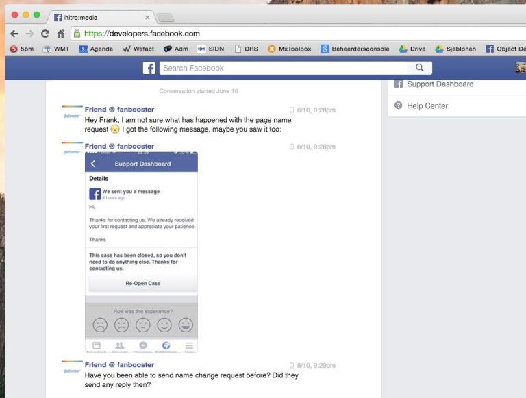 Dit was mijn laatste strohalm. Directe partners van Facebook kunnen vaak wel door de dikke muren van Facebook dringen. Iemand die bij Fanbooster (een van de weinige officiële marketing partners van FB) werkt wilde mij wel helpen. Zij heeft via een andere weg hetzelfde verzoek gedaan. Uiteindelijk konden ze bij Facebook niets doen omdat het verzoek al eens eerder was afgewezen.