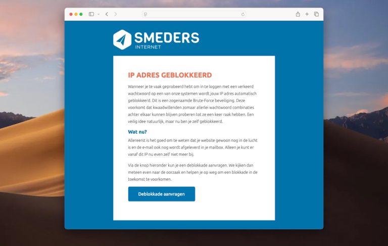 Wanneer je te vaak geprobeerd hebt om in te loggen met een verkeerd wachtwoord op een van onze systemen wordt jouw IP adres automatisch geblokkeerd. Dit is een zogenaamde Brute-Force beveiliging. Deze voorkomt dat kwaadwillenden zomaar allerlei wachtwoord combinaties achter elkaar kunnen blijven proberen tot ze een keer raak hebben. Een veilig idee natuurlijk, maar als je zelf een verkeerd wachtwoord hebt ingesteld wordt jouw IP dus ook geblokkeerd. Wanneer je jouw website probeert te bereiken zie je bovenstaande pagina verschijnen. Is mijn account nu afgesloten? Nee. Jouw website is gewoon nog in de lucht en de e-mail wordt ook gewoon nog afgeleverd in jouw mailbox. Je kunt er alleen zelf niet meer bij vanaf de locatie waarop je de verkeerde wachtwoorden hebt gebruikt. Als je de blauwe pagina op jouw PC ziet en de website bezoekt via jouw mobiel op 4G dan zal je zien dat alles nog gewoon draait. Kan mijn IP gedeblokkeerd worden? Geef het IP dat je op het blauwe scherm ziet door aan onze helpdesk via de deblokkade pagina. De link naar die pagina vindt je op het blokkade scherm. Ook kunnen we de reden van de blokkade voor je achterhalen zodat je jouw eigen systeem kunt nakijken. Wacht daar dan ook niet te lang mee, want anders wordt je natuurlijk weer geblokkeerd. Wat is mijn IP adres? Via deze tool kun je je IP adres zien. Sommige providers hebben een zogenaamd dual-stack IP adres. Ook deze adressen zijn zichtbaar in onze IP tool.